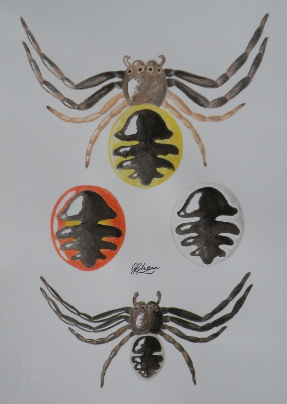 (in effetti le 'sbavature' del disegno nero sull'opistosoma della femmina erano intese come irregolarità, per non fare un disegno troppo regolare...solo che sembravano, appunto, sbavature quindi negli altri due opistosomi non le ho fatte...)