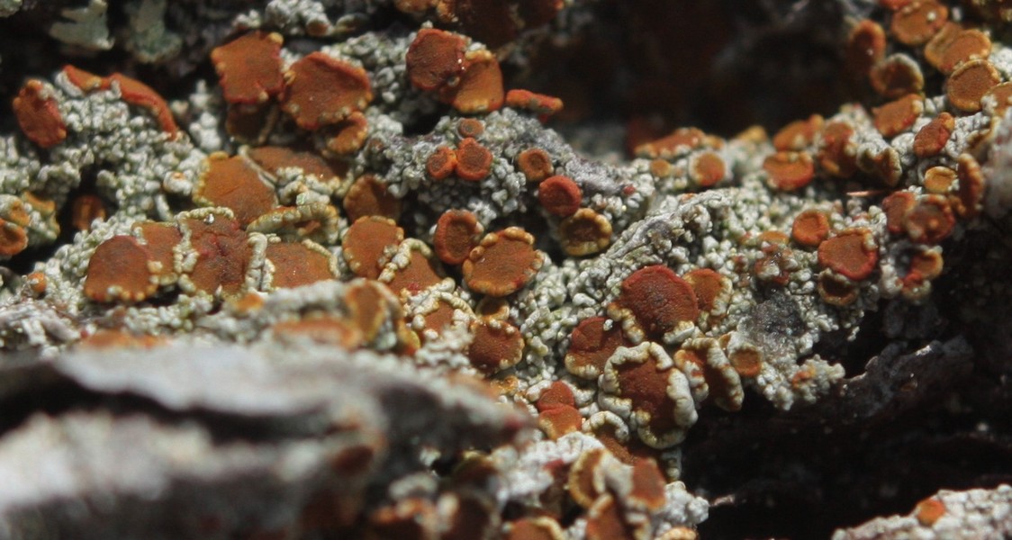Caloplaca ferruginea. Il margine degli apoteci è rossastro un pochino più scuro del disco. Tuttavia si notano degli apoteci provvisti di un margine bianco che è una proliferazione del tallo (non è il margine degli apoteci).