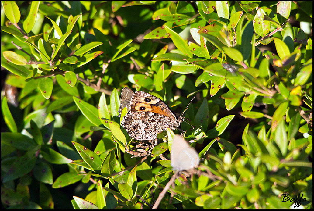 Per i soggetti ripresi nella terza foto (due per la verità si vedono anche nella prima foto una davanti e l'altro dietro l'Hipparchia sp.) si tratta di Satyrium ilicis (Esper, 1779) - Lycaenidae. Ti rimando a questa discussione per maggiori informazioni.  |