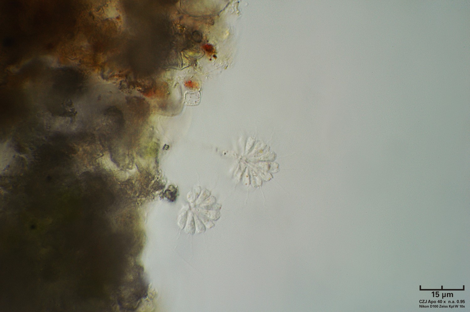 ..sono certo che è qualche specie di Synura (alghe dorate) ma non so quale! normalmente è possibile vederne il colore ambrato ma se le condizioni di luce o di ambiente non sono favorevoli , si scoloriscono... ciao cmq |