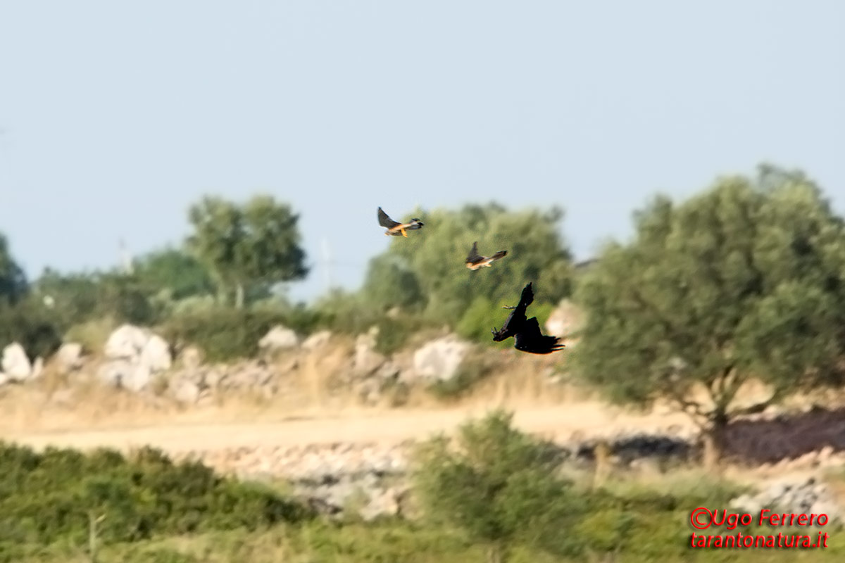 Salve, vorrei mostrarvi delle foto fatte senza nessuna pretesa ma che documentano lo scontro tra una coppia di gheppio/grillaio e una di corvo imperiale ai margini di una gravina nel tarantino. Mi sono meravigliato non poco nel vedere il corvo volare al contrario ! Foto del 21 maggio scorso