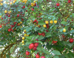 Questi alberi sono al margine di campi coltivati e d'estate si riempiono di piccoli frutti di 2-3 cm di diametro, che variano dal giallo, al rosso vivo al rosso scuro. sono delle susine. la specie è il Prunus cerasifera e cioè il mirabolano?
