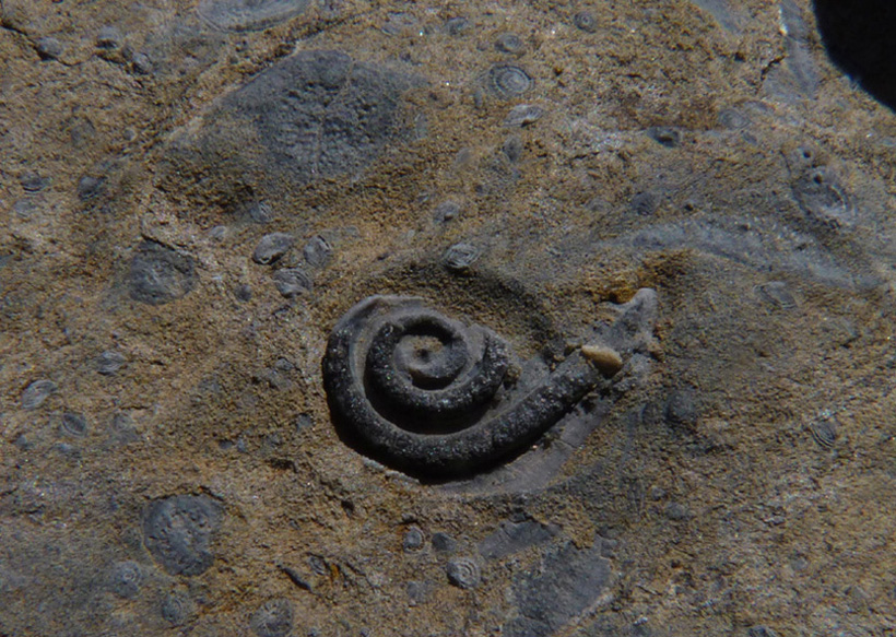 A giudicare dai foraminiferi visibili, penso si tratti di fossili cenozoici .. probabilmente eocenici ; per quanto riguarda alla "spirale bruna" , sarei per il modello interno dell'Anellidae : Rotularia spirulea(Lamarck).