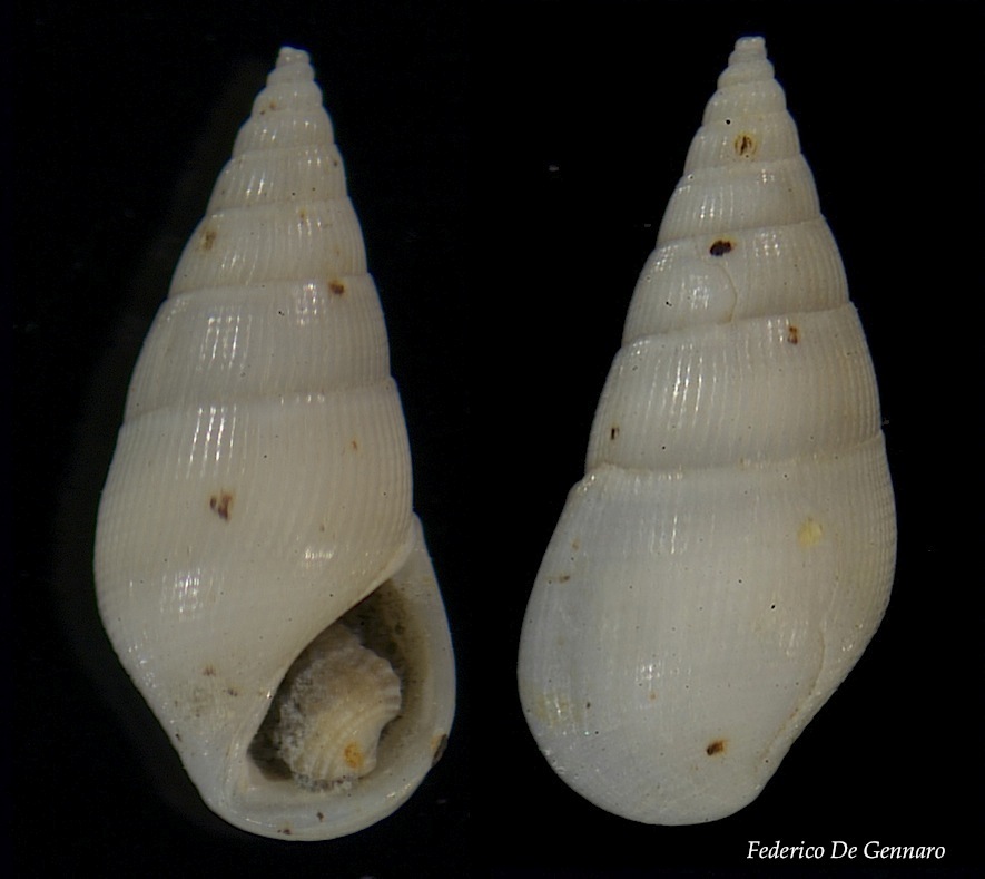 | Non credo, Rissoina pusilla dovrebbe avere coste assiali più distanziate e struttura un po più cilindroide, io mi indirizzerei a confronti con materiale recente. |