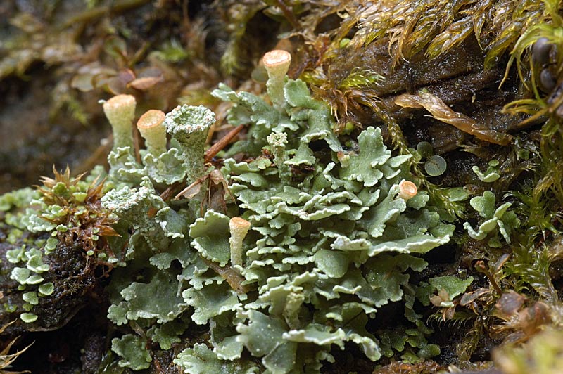 Questa sembra proprio la vera Cladonia pyxidata. Anche questo è un gruppo molto rognoso, che contiene diverse specie differenziabili con sicurezza solo sulla base di caratteri chimici. Le coppe contengono schizidi (cioè piccoli frammenti di tallo con fungo ed alga) che servono a riprodurre il lichene per via vegetativa. Nella foto si vede molto bene una caratteristica comune alle Cladonie: l'esistenza di un tallo primario basale a forma di squamette e le strutture riproduttive (podezi) che da esse si elevano.