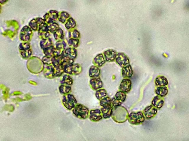 E' possibile che le immagini ritraggano l'alga azzurra Nostoc? Eil pallino verde pallido è un eterociste?