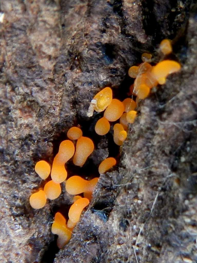 Di primo acchito ho pensato a Bisporella Citrina, che col clima secco tende al giallo arancio. Ma forse non è lui. Ho pensato anche a Phaeoelotium Sub Carneum, ma non è. Non mi vengono altre idee e mi arrendo.