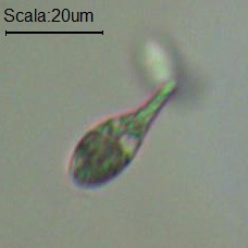 In un prelievo diverso, effettuato in un altro luogo, ho visto un microrganismo che mi sembra molto simile. Poiché si è fissato al vetrino ho potuto osservarlo meglio: questo ha sicuramente il flagello e compie movimenti euglenoidi (?).