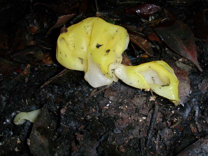 Tremella mesenterica, consistenza gelatinosa, da gialla ad aranciata,viscosa e accartocciata,non tossica ma di sapore scadente come legno dolciastro(liquirizia).