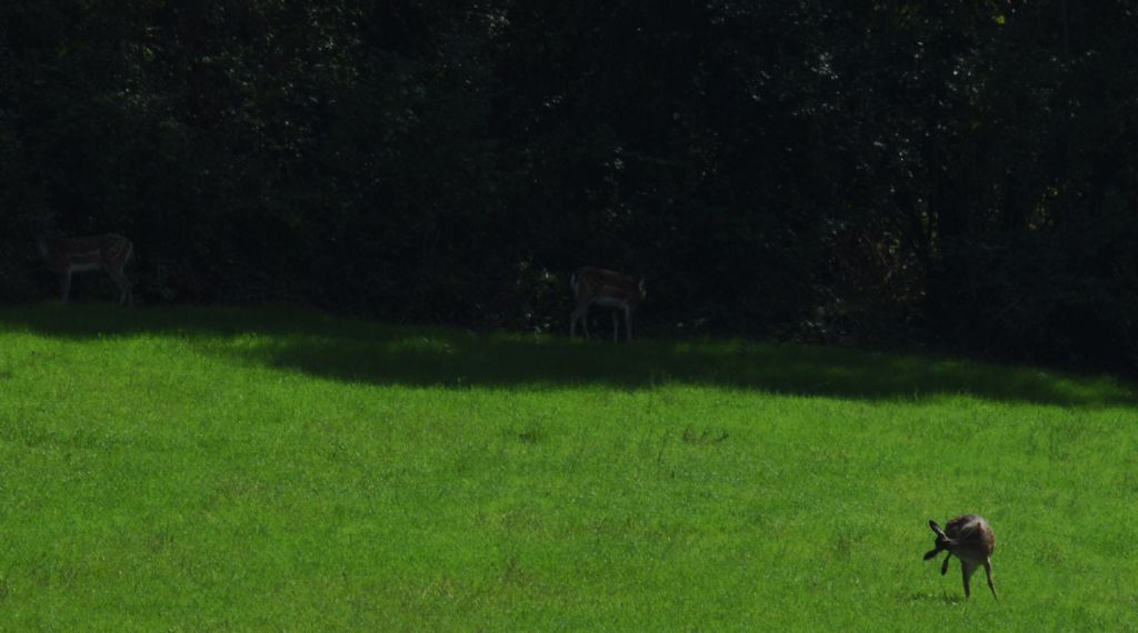 Sono tutti daini. Per il sesso solo in alcune foto si riesce a distinguere qualcosa. Per esempio nella foto da 86,1 kb si nota un giovane. Direi maschio per l'abbozzo del pennello. Sullo sfondo una femmina che manca totalmente del palco.