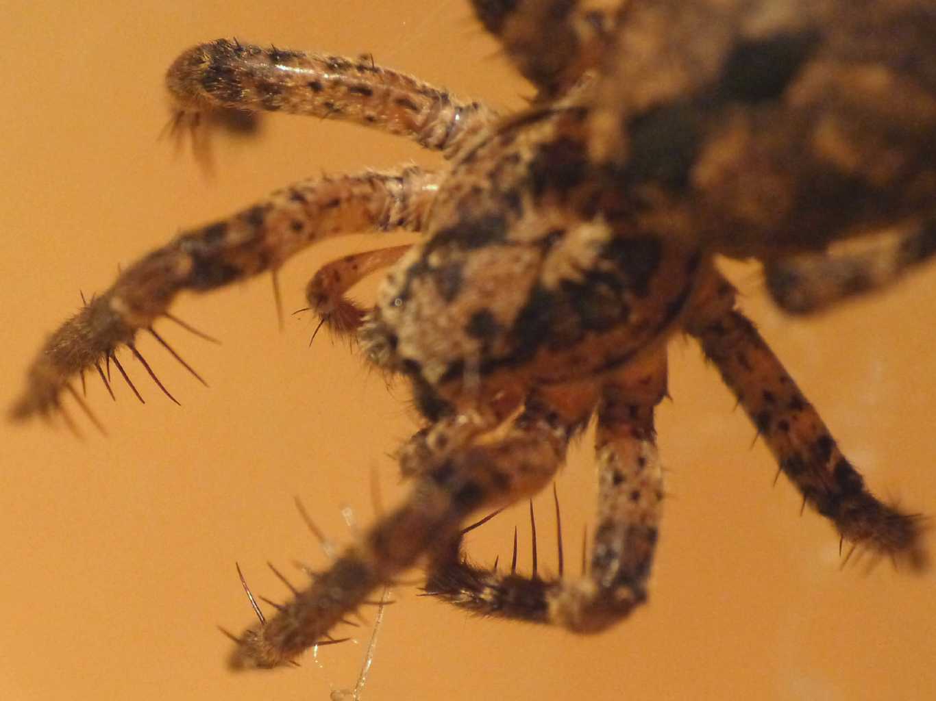 Nel dettaglio si vedono le spine che probabilmente danno origine al nome della specie. Sono spine piuttosto robuste che il ragno drizza quando attacca, o, a volte, semplicemente quando è irritato. Ma non è facile che le mantenga erette a lungo, come in questo caso. Di solito sono tenute aderenti alla zampa, rivolte in avanti, e si vedono appena. Ci sono altri ragni dotati di spine erettili, ma non così vistose. Per esempio, Dolomedes e alcuni Lycosidae. Difficile stabilire se aiutano il ragno ad afferrare la preda o se servono a tenerla scostata dalla zampa in modo che non cerchi di morderla. Il fatto che le ritrae subito dopo l'attacco farebbe pensare alla prima ipotesi.