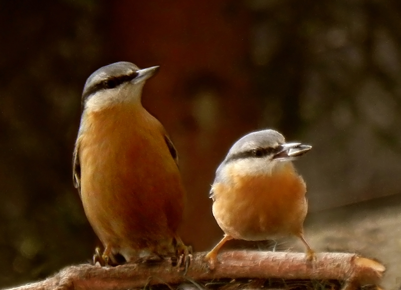 Sono picchi muratori, Sitta europaea. Comuni dalle nostre parti e gran frequentatori di mangiatoie. Si chiamano "muratori" perchè portano fango per restringere il buco d'entrata del loro nido, se è troppo grande. Infatti nidificano in buchi di alberi e cassette nido. Il nome "picchio" deriva dall'abitudine di percorrere il tronco degli alberi per cercare cibo. Ma appertengono all'ordine dei Passeriformi, proprio come le cincie.