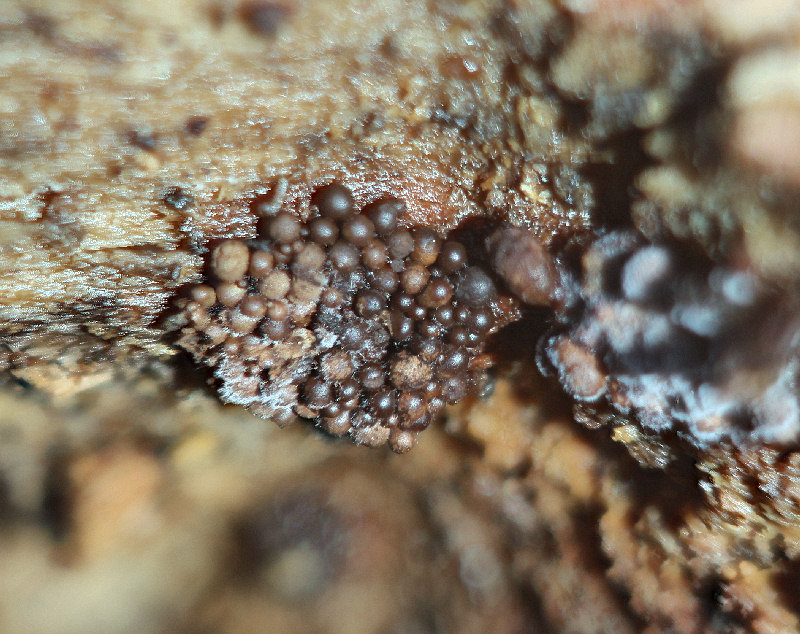 l'intero gruppetto misura circa 8 mm, la foto è fatta sul posto, ma ho staccato un frammento di legno marcio e l'ho appintato in una scatola.