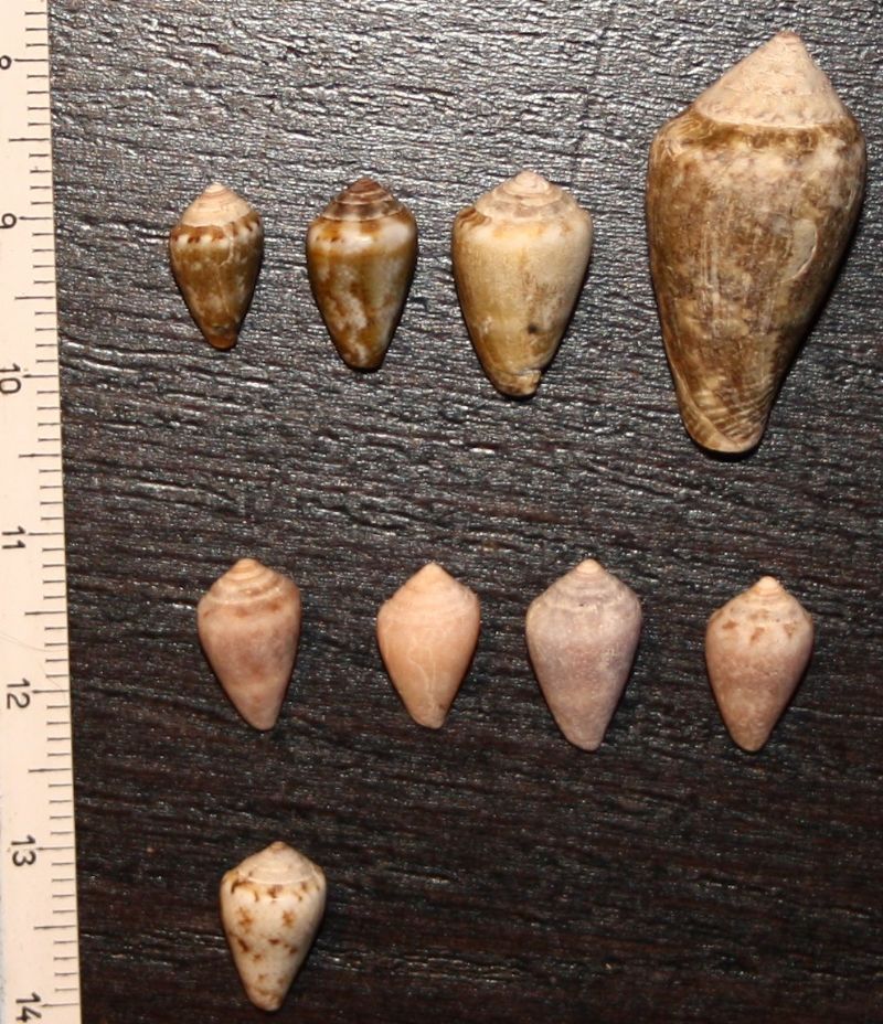 le prime due foto riprendono esemplari di cono mediterraneo, le altre due esemplari di columbella rustica, l'esemplare in basso dell'ultima foto dovrebbe essere una Pisana maculosa, che attualmente ha un'altro nome.