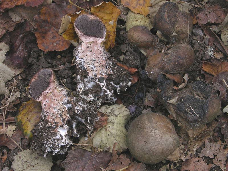 I cordoncini e rizomorfe miceliari di tono rosato fa pensare a uno Scleroderma verrucosum.