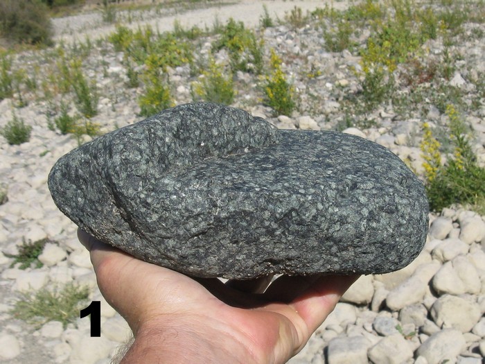 Se hai la possibilità di romperle e vederne l’interno più da vicino sarebbe utile; la prima, è vero, potrebbe essere un gabbro, ma anche altro...(diabase?);