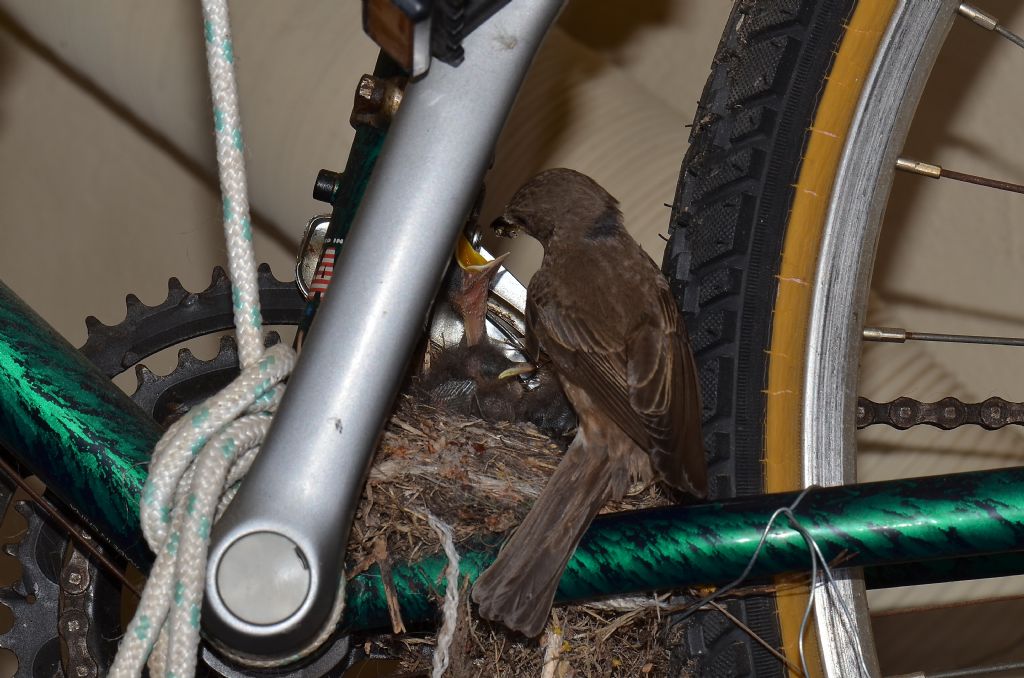 I bimbi crescono!! A questa età sono già in grado di scappare dal nido, se spaventati? La bici è in un punto di passaggio obbligato, a 2 metri d'altezza e non vorrei trovarli a terra o, ancor peggio, fra le grinfie del gatto.
