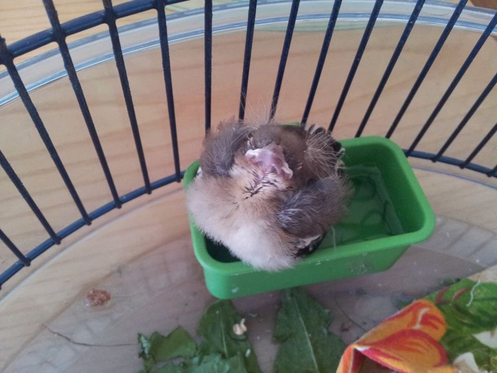 Salve a tutti, ieri ho trovato un piccolo uccellino caduto dal nido e ho deciso di metterlo in una gabbietta. So che è sbagliato, ma da me è pieno di gatti randagi e ho temuto che gli accadesse qualcosa di brutto. Per dargli da bere uso una cannuccia, gliela appoggio al becco e faccio scendere poche gocce per volta; se ha sete le beve, altrimenti nulla. Prima ho provato a metterlo fuori e ho notato che i genitori accorrevano in suo soccorso cercando di nutrirlo, solo che lui, invece che volargli dietro, zampettava in giro per il mio giardino. Ho provato poi a dargli da mangiare delle briciole di biscotti, ma non ne vuole sapere di mangiarle. Lui continua a lamentarsi. E' molto piccolo, cosa posso fare ? Immagine: