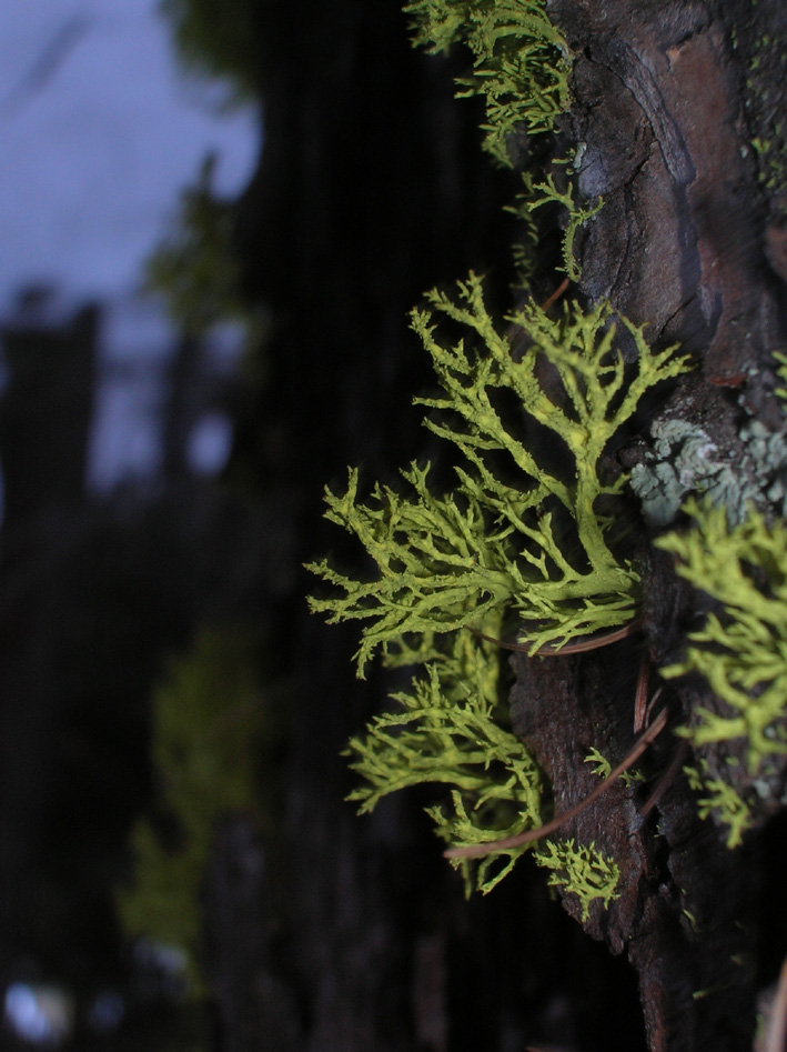 Questa è Letharia vulpina, uno dei pochi licheni veramente velenosi (il nome allude al suo uso per preparare veleni contro le volpi ed i lupi). Da noi è tipico della fascia subalpina, su larici e pini cembri, ma è stato trovato, anche se rarissimo - sino alla Calabria. Quando lo si maneggia bisogna stare attenti a non toccare occhi e mucose, perchè ha un effetto fortemente irritante. Molti anni fa sono stato malissimo dopo aver "scalato" un larice coperto di Letharia per fare un rilievo della vegetazione lichenica. L. vulpina è la specie secondaria, che si riproduce vegetativamente tramite soredi. La specie fertile primaria è L. columbiana, che vive sulle Montagne Rocciose, soprattutto nelle foreste di sequoie. PL Nimis |