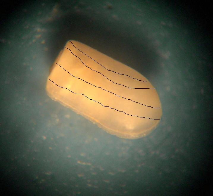 Salve, vorrei sapere se ho classificato correttamente questo esemplare proveniente dalla Croazia, 2 m di profondità. La conchiglia misura circa 2-2,5 mm, bianca traslucida e interamente striata con strie fitte e parallele: poichè non riesco a rendere le striature con le foto ne ho "ripassate" alcune per farvi capire più o meno la direzione (salvo tremolii del mouse).