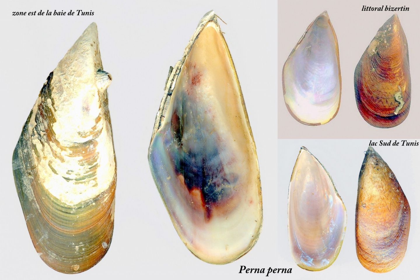 Perna perna? coquille noire teintée de vert, forme allongée, charnière épaisse, coquille très solide pour la baie de Tunis (taille maximale observée 90 mm), brune avec des chevrons plus foncés, coquille relativement mince taille maximale 80 mm pour la zone de Bizerte et 180 mm pour la partie la plus marine de la lagune de Tunis (balises de l'entrée du port).