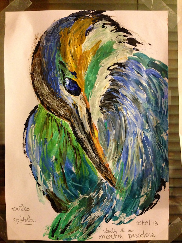 Ciao a tutti! dopo tantoooooo tempo ritorno a farvi visita....e dopo tanto tempo stanotte presa dall'insonnia ho buttato li in un foglio un ritratto di martin pescatore preso da una rivista....l'ho fatto con colori acrilici ke si trovano nelle scatolette per principianti (che ho comprato una settimana fa) e steso con la spatola di plastica compresa nella confezione.