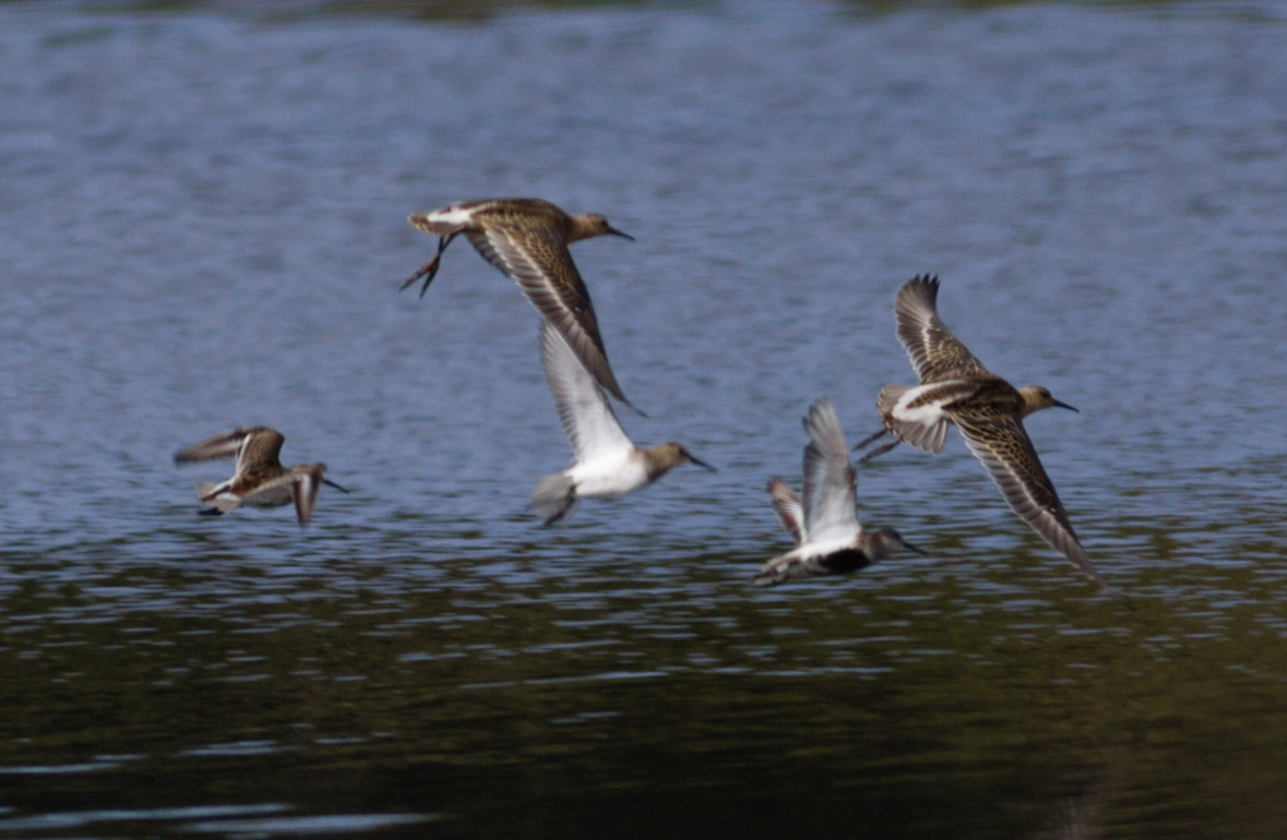Ho una perplessità sul limicolo ripreso in questa sfocata foto, il terzo da destra: in alto ci sono 2 combattenti, tra i 2 piovanelli pancianera cè questo che sembra un combattente ma, sebbene sia leggermente dietro, ha dimensioni minori (femmina?)in particolare le zampe e soprattutto non ha le parti inferiori del corpo sfumate/omogenee come mi aspetterei, ma si intravede un bel contrasto tra il petto marrone ed il ventre bianco.