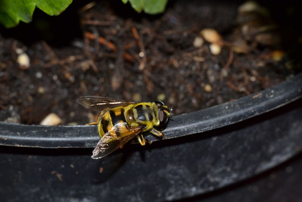 Un cupo ronzio proveniente da un vaso di Ibisco ha attratto al mia attenzione ed il "colpevole" non era altro che questo Sirfide il quale si introduceva nel terriccio umido e poi ne usciva ricominciando il "giro". Ho cercato anche sulla rete per capire cosa fosse ma l'unica foto simile riportava la generica scritta "Sirfide". Mi affido alla vostra esperienza per sapere chi è il simpatico e rombante insetto. Ho pensato ad un Eristalis tenax ma questo ha lo scudetto, spero si chiami così, completamente diverso.