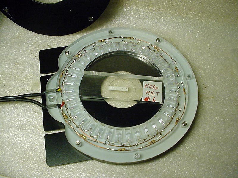 Il pezzo base è un supporto che va montato sul tavolo del microscopio e che porta il generatore di luce, una corona circolare di led. Al centro di questo supporto, va montata la lente collettrice costruita nel plexiglass a guida di luce e disponibile in varie forme, a seconda dei soggetti da fotografare.