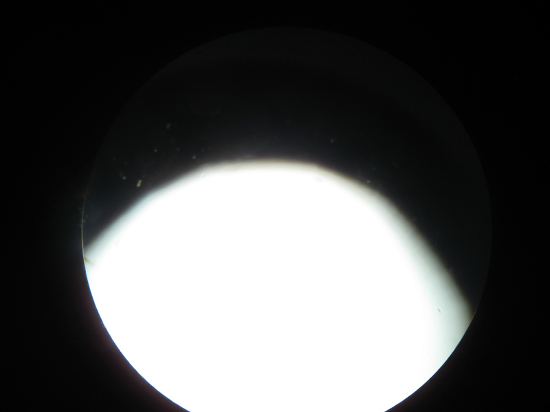 Vediamo di rimediare dicendo che dall'aspetto della foto che hai fatto, mi sembra molto probabile che il condensatore sia fuori centro. Se così fosse, di fianco al condensatore vi dovrebbero essere due viti che, muovendole, ti permettono di riportare in centro il foro del diaframma di apertura, quindi di centrare il condensatore.