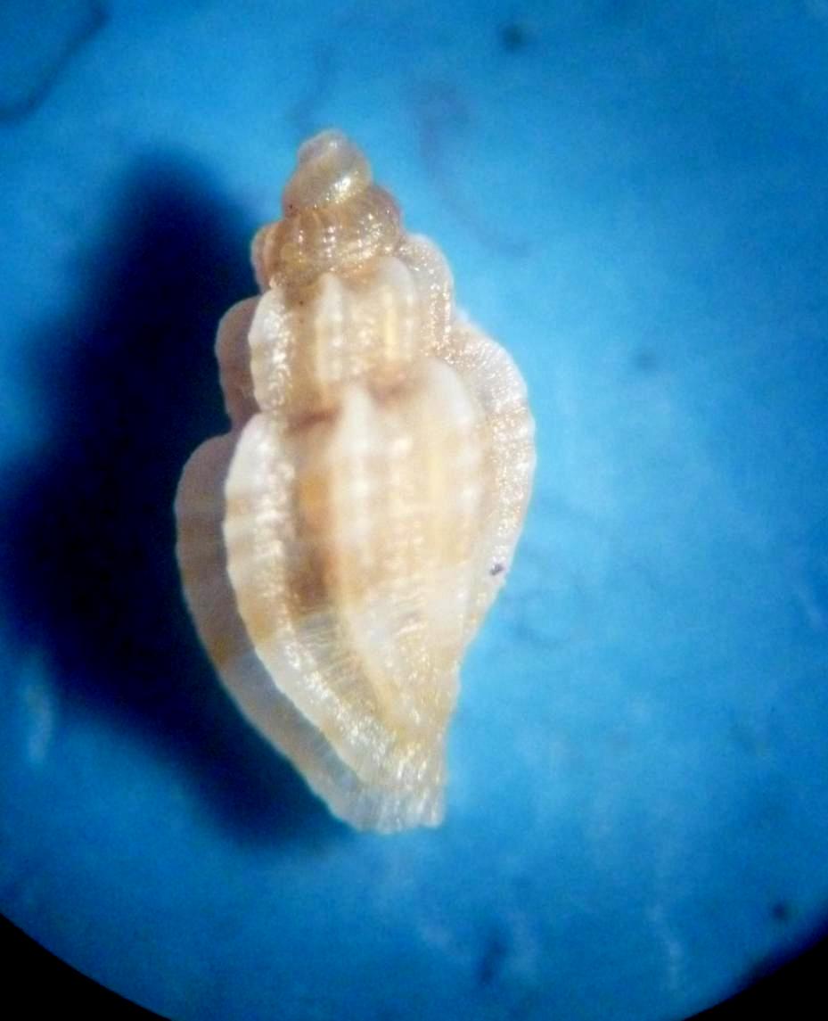 Questa conchiglietta non vuole farsi fotografare (come vedete le foto sono pessime ma ho provato a ripeterle per niente). Misura circa 3 mm e proviene dalle coste della Croazia centrale. Le zone che nelle foto appaiono più scure sono percorse da 4 strie spirali incise perfettamente equidistanti che diventano 3 e poi 2 verso il canale sifonale (e che per motivi che non so non si vedono mai nelle foto) e sono intervallate da zone più chiare lisce che potremmo anche interpretare come un cordone grosso e piatto. Questa scultura è evidente anche sulle coste assiali. Protoconca poligira (mi sembra). Un aiuto per la determinazione?
