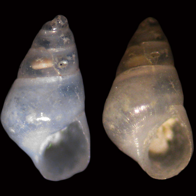 ...anche qui strie di accrescimento prosocline, dente columellare ben visibile (nella foto è occultato dallo sfondo bianco di un granellino interno. La conchiglia fotografata è la stessa ma ripresa con due angolazioni lievemente diverse per evitare effetti ottici...