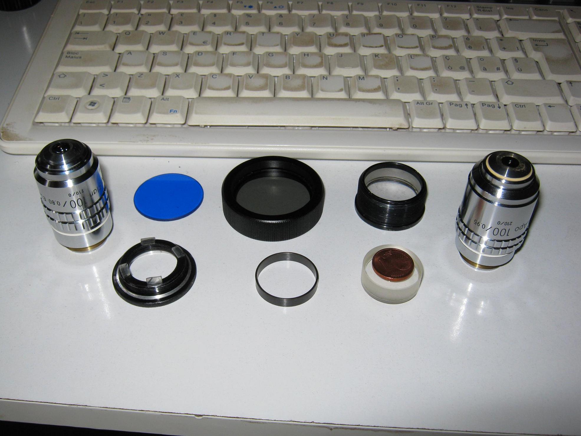 Questa mia ennesima fatica tecnica ha origine dal fatto che mi sono messo in testa di utilizzare un solo microscopio (ovviamente il Lab nuovo) ed un unico condensatore per tutte le tecniche in cui interviene la luce trasmessa (ovviamente). Quindi vi presento il mio nuovo condensatore BF/DF/LOC/POL/CDF. Ecco tutti i pezzi che servono: l'obiettivo LOC Nikon 80x, un filtro blu, un polarizzatore, una lente divergente (divertitore), un "tappo" ad anello delle dimensioni giuste per la "cavità" del condensatore, un anello porta lente, una lente convergente (questi due selvaggiamente sequestrati ad un vecchio oculare), una moneta da 1c attaccata sulla lente divergente (possibilmente al centro esatto) con un frammento di biadesivo (grande invenzione, questa) ed il "fratello maggiore" del primo obiettivo, il Nikon 100x. Ora si che Sapiens potrà dire che questa Loc vale 1c.