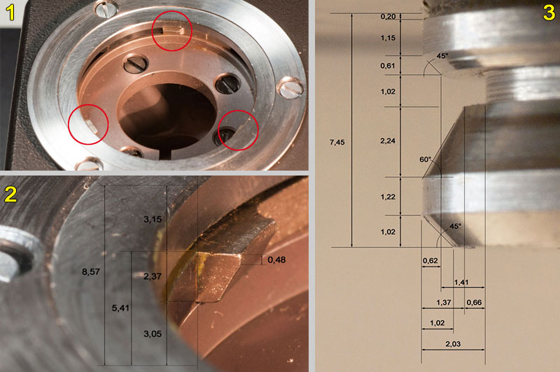 86,76 KB ]1. L'attacco a coda di rondine sullo stativo del Laborlux è perfettamente circolare e la testata è trattenuta in sede da tre "dentini" che si serrano intorno alla coda di rondine della testata grazie a delle molle e che è possibile aprire manovrando un'apposita levetta. 2 e 3. Il dentino visto di profilo e l'attacco della testata, quotati secondo le misure che sono riuscito a prendere o a calcolare. Naturalmente la precisione NON È al centesimo di millimetro come le due cifre decimali potrebbero far pensare
