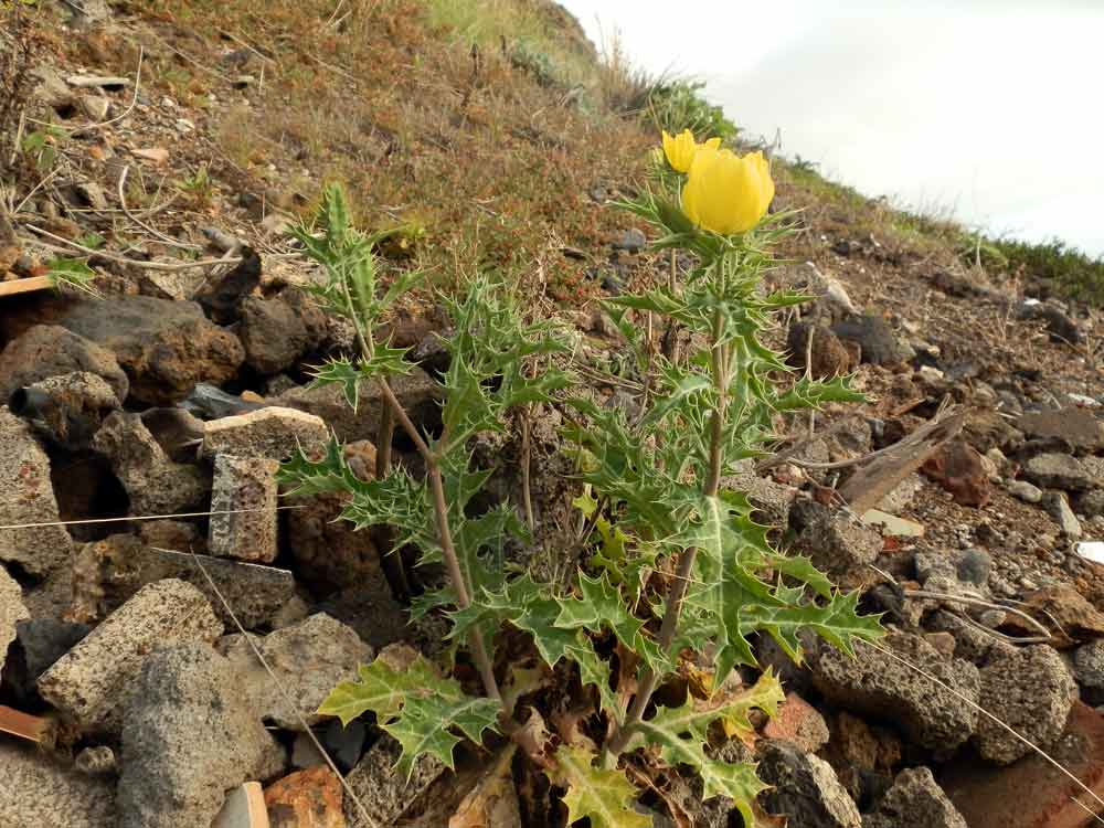 Argemone mexicana El cardosanto es una papaveracea de origen mexicano introducida en Canarias donde tiene carácter invasor. Se da especialmente en zonas bajas aunque es posible verla en zonas de pinar siempre que la alteración del medio lo permita. Se trata de una planta que llega al metro de altura y que posee unas características hojas grises y espinosa y unas vistosas flores de color amarillo pálido. En Canarias está confirmada en Gran Canarias, Tenerife y La Palma.
