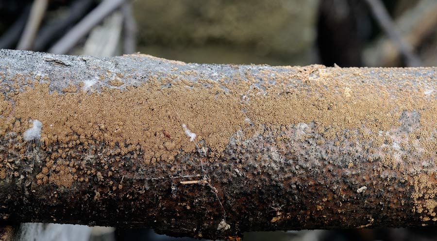 C'est peut-être l'anamorphe de quelque pyrénomycète (Ascomycotina) dont le stade téléomorphique est visible sur la photo. Ou autre chose, mais non un basidiomycète selon moi (...et surtout selon Hollande, qui est mon conseiller technique )
