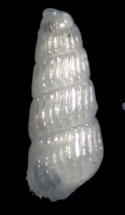 Ciao , questo esemplare dalla costa Campana, lungo 2 mm, dovrebbe essere una juliae, ma presenta delle coste assiali ortocline, giri piani ed assenza di ombelico. Per la protoconca non mi esprimo. Le caratteristiche di cui dispone mi orientano, vista la tabella di riconoscimento dellle Chrysallida in forum, verso la clathrata, ma la foto di questa specie presente nella monografia dedicata al genere, non gli somiglia affatto? Vedendo l'esemplare angolato in un certo modo rispetto alle fonti d'illuminazione, tra le coste assili si evidenziano tutta una serie di puntini, particolare che spero si veda nella foto del dorso. Chiedo un parere agli esperiti, saluti, flavio Immagine:
