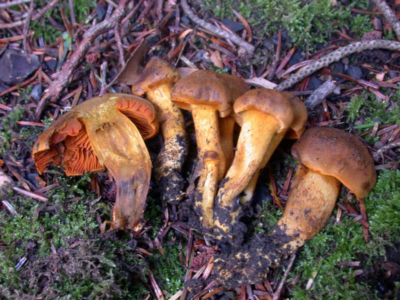 Cortinarius (Drmocybe) malicorius: distintononso.o dalle lamelle arancio vivo, ma anche dalla presenza di toni verdognoli nella carne.