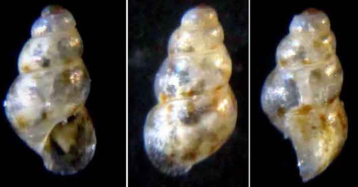 mm. 1,5 / 1,7 Molto slanciata - Ombelico molto piccolo - apice marroncino - due bande colorate nell'ultimo giro, disposte come si vedono. Detrito del Litorale di Brucoli.