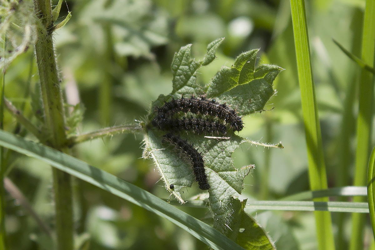 Sono i bruchi dell' Aglais io che sgranocchiano ortica, la loro pianta nutrice