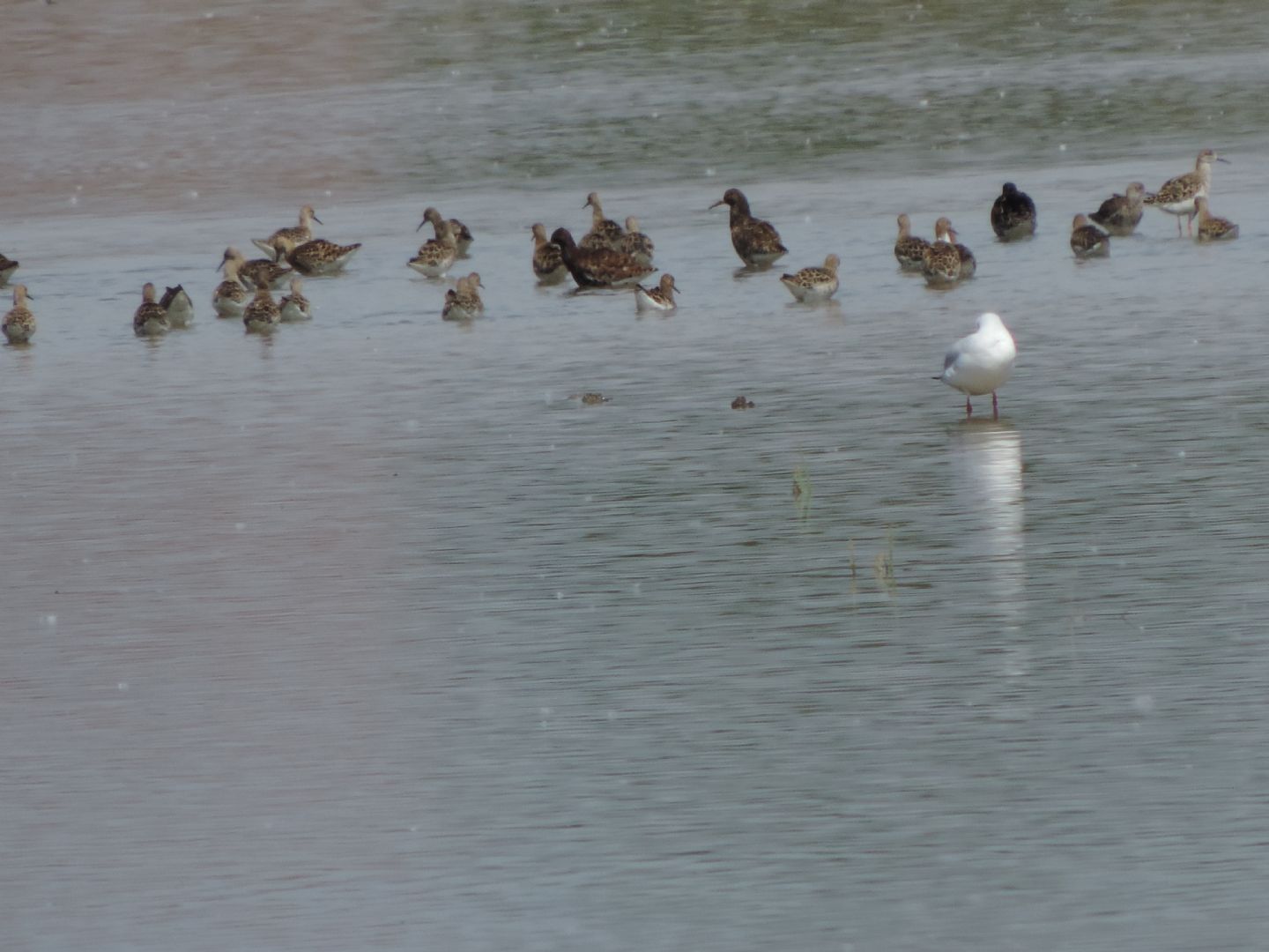 Venerdì nelle risaie del vercellese ho visto questo gruppo di 65 Combattenti. Tutto normale, ma c'erano 4 esemplari che risultavano molto distinguibili dagli altri, sia perchè avevano già un piumaggio molto più estivo, sia per le dimensioni decisamente più grandi. Ora, posso capire che in uno stormo individui diversi siano ad un diverso stadio della muta, ma come si spiega questa vistosa differenza di grandezza? Tra l'altro, quando ho provato ad avvicinarmi, quasi tutto il gruppo è decollato, ma 7 sono rimasti, e fra questi erano compresi tutti e 4 gli esemplari particolari! Possibile che si tratti di una incredibile coincidenza o c'è un'altra spiegazione?