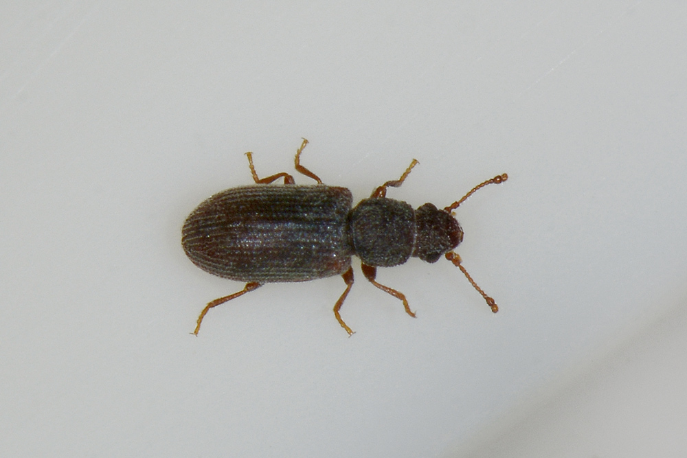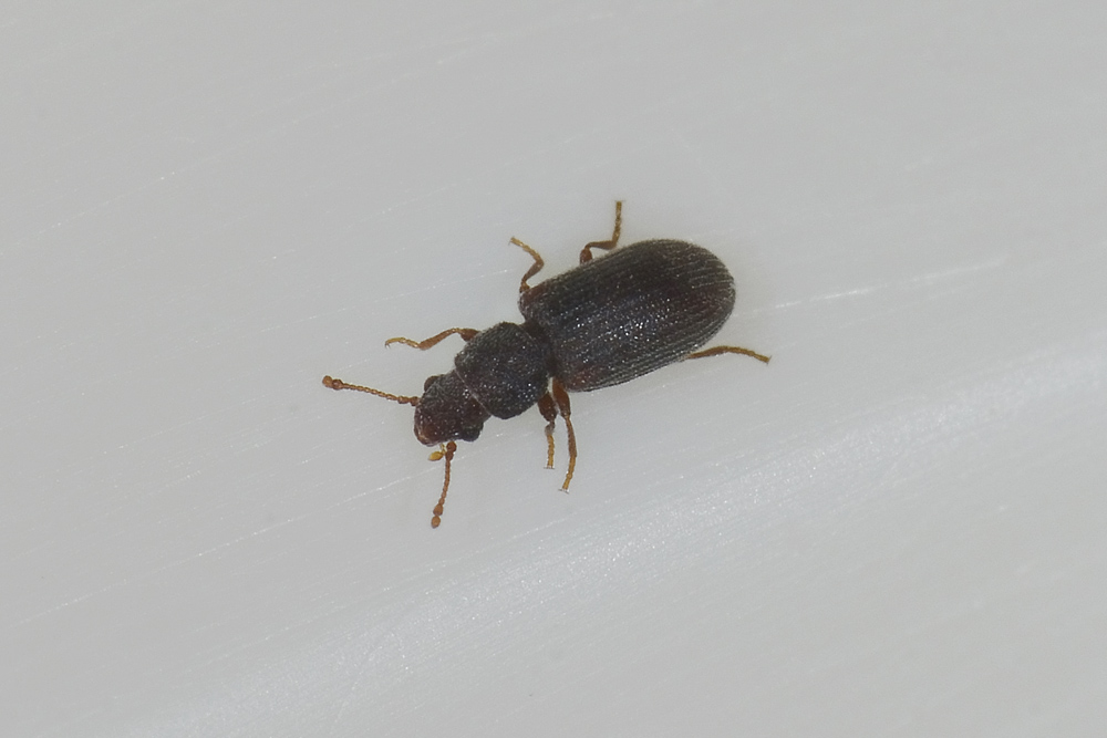 Questo Coleotterino 2 mm. scarsi, ero convinto che fosse uno Zopheridae, mi sembrava uguale a quello che avevo trovato a San Giorio. Ha dei punti rossi alla base delle elitre come anche le setole uguali all'altro. Però a parte le dimensioni, la conformazione degli occhi non sono uguali, come del resto anche le clave antennali. Io mi sono scervellato per capire cosa possa essere, senza nessun risultato. Si potrà capire cosa sia? Grazie