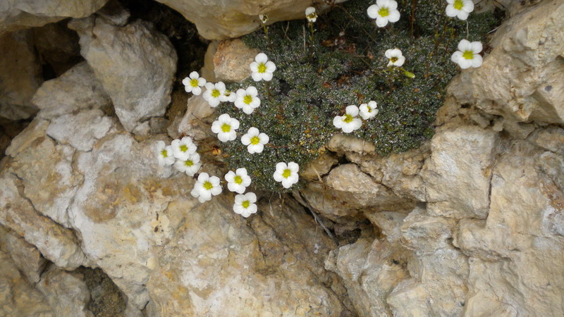 Sembrerebbe Saxifraga squarrosa, ma potrebbe essere Saxifraga caesia. Le due specie appartengono allo stesso gruppo, sono entrambe presenti nella zona e si distinguono per particolari minuti non ben visibili nelle foto (ci vorrebbe un'immagine molto ravvicinata delle foglie).