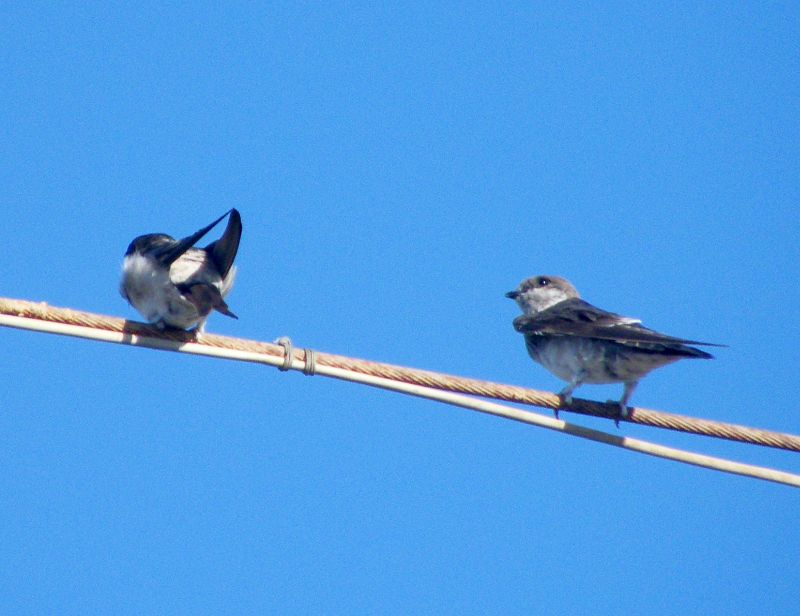 Scusate, ho avuto troppa fretta nel rispondere. In effetti il bianco sopra la base della coda non è un riflesso del sole come avevo creduto... Tuttavia, anche quello a desta nella prima foto è un Balestruccio? Mi sembra che abbia una colorazione troppo chiara e grigia al posto del tipico nero-bluastro(può anche essere un effetto del sole o della foto, o il fatto che sia effettivamente un giovane B.)e non si vede la zona sopra la coda. Non avendone mai visto uno dal vivo, vorrei sapere come meglio riconoscerlo dal balestruccio. |