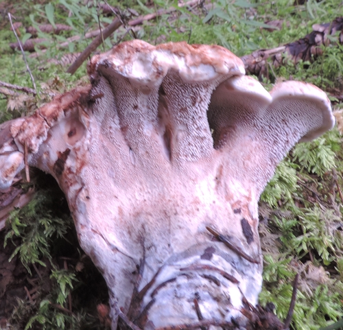 Alpi,Canazei in bosco di pecci con muschio alto un palmo accanto una radice questo fungo alto circa 20 cm. Ciao Lago