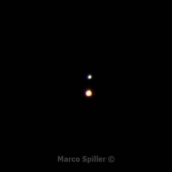Bello il contrasto di colori delle due stelle, sembrano quasi un sole orbitato da una super-terra.   |
