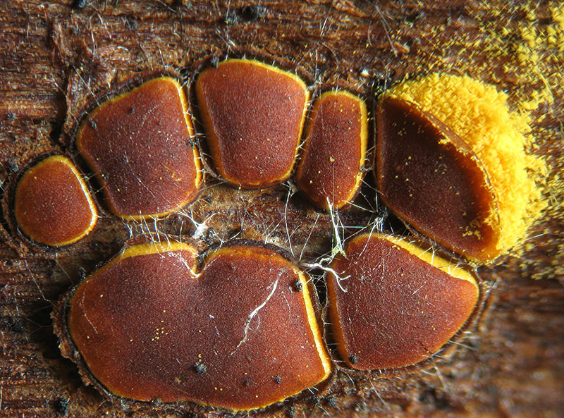 anche questa l'ha trovata la Cri, che prima ancora di vederla la si deve immaginare per quanto è piccola e concolore al substrato... si rivela giusto per il capillizio color oro che se uno si cava gli occhi riesce a percepirlo sul marrone scuro del legno e non è nemmeno tra le specie reperibili con maggior frequenza. Tronchi tagliati e accatastati nel bosco,(forse di Salix sp), sollevando le cortecce e quindi sull'interfaccia corteccia-legno, ambiente per'altro tipico dalle mie osservazioni del genere Perichaena; Sesto Calende 14 novembre scorso.