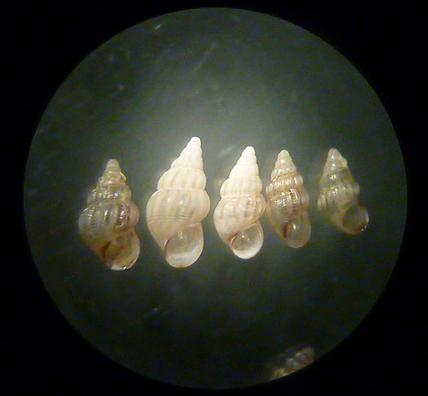 Posto la foto di un gruppetto di conchiglie che penso appartengano tutte alla stessa specie anche se hanno dei profili un po' variabili, le dimensioni vanno da 2,5 mm a 3,5 mm circa.