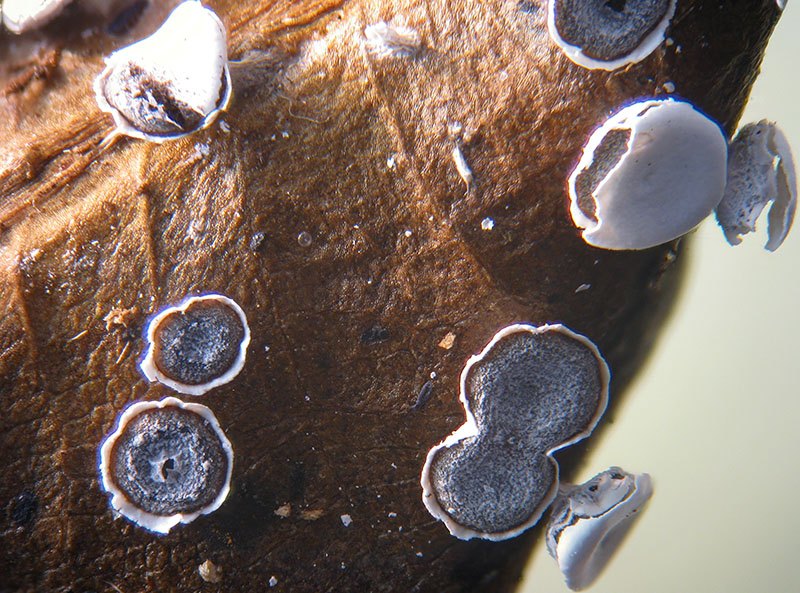 Dai boschi igrofili attorno al Lago di Varese, ieri; la foto sopra a 20x misura i soliti 7x5 mm e sull'identificazione della specie non credo possano esserci dubbi. Il Mixomicete si è sviluppato sulla lettiera di foglie del sottobosco e su qualche stelo verde erbaceo. Le prossime immagini misurano tra 2,5x2 mm e 3x2,5 mm: