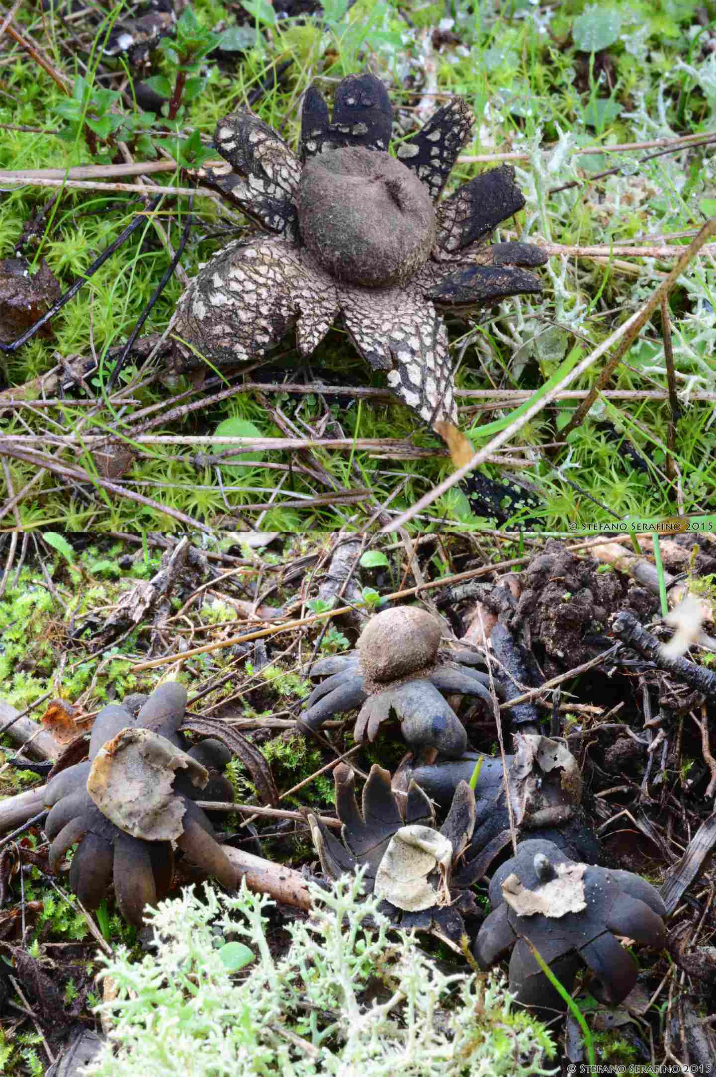Ho il sospetto si tratti di due entità diverse in quanto il soggetto della prima foto ha quelle squamette bianche sulle lacinie mentre il gruppo della seconda sembra avre lacinie completamente nere. Questi organismi li ritrovo molto spesso dalle mie parti, in aree più o meno umide con lettiera di macchia o briofite, sempre in luoghi aperti quali radure o sentieri.